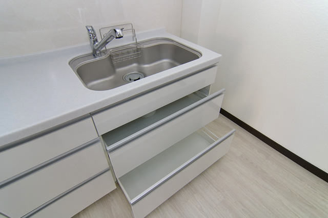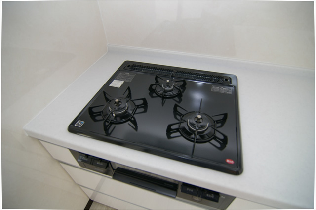 (間取) (外観)物件資料 (玄関)システムキッチン3口コンロ 都市ガス換気扇浄水機能付きシャワー水栓引き出し収納LDK